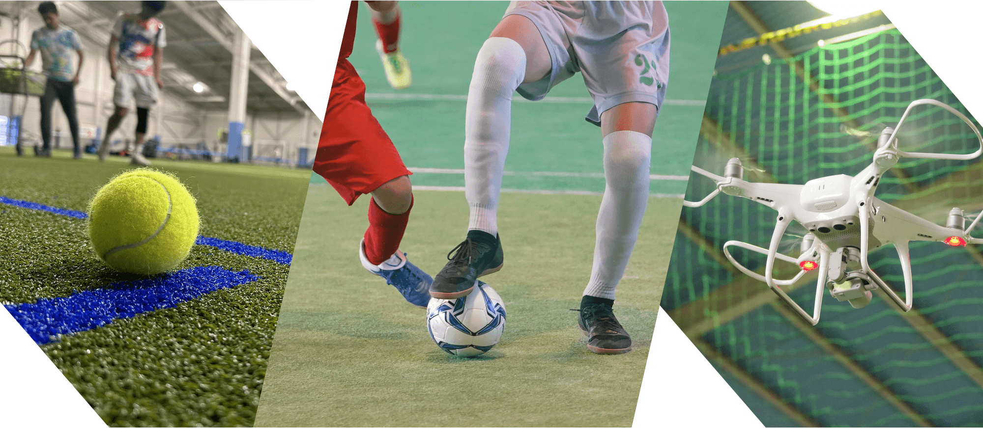 明るく広々としたインドアコートは、テニス・フットサル兼用で広く4面を確保。また、ドローンの講習会場としてや多目的利用も可能です。